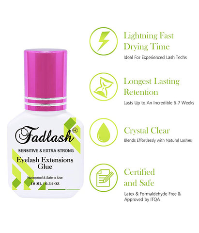 Fadlash extra-strong lash extensions glue, especially for sensitive eyes. 1-2 Seconds Drying Time, 6-8 Weeks Retention Period – Developed for Professional Lash Artists to bond lash in an instant, the eyelash extension glue dries in 1-2 seconds.